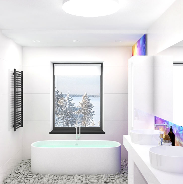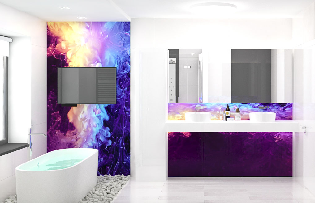 - панно из кислотно-ярких цветов в белой ванной, отражающееся в ней и на сантехнике и т.д.
